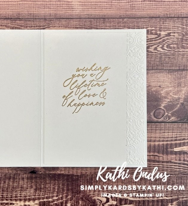 For the inside, I added a layer of Very Vanilla. To maintain the simplicity and elegance, I dry embossed the right edge of the layer. For the inside sentiment, I heat embossed using Gold Embossing Powder.